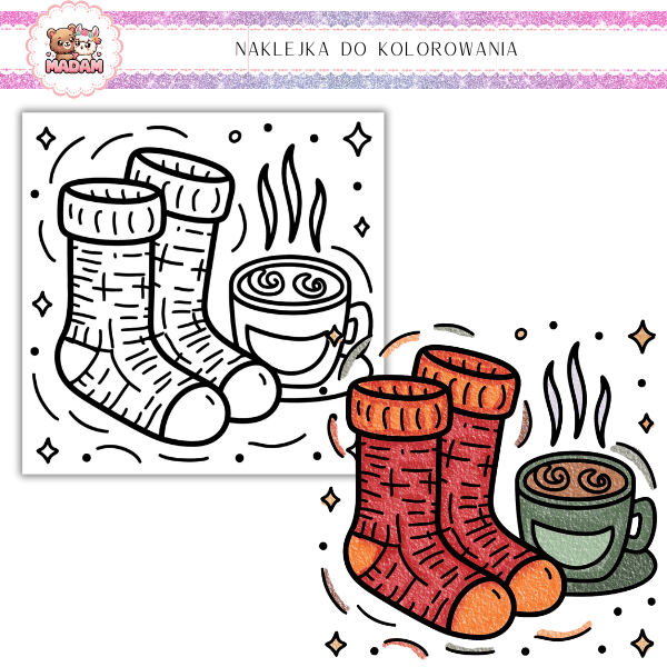 Kolorowanka Samoprzylepna 13x13 dla dzieci Jesień Skarpety na Kawowej Misji MaDam Creative