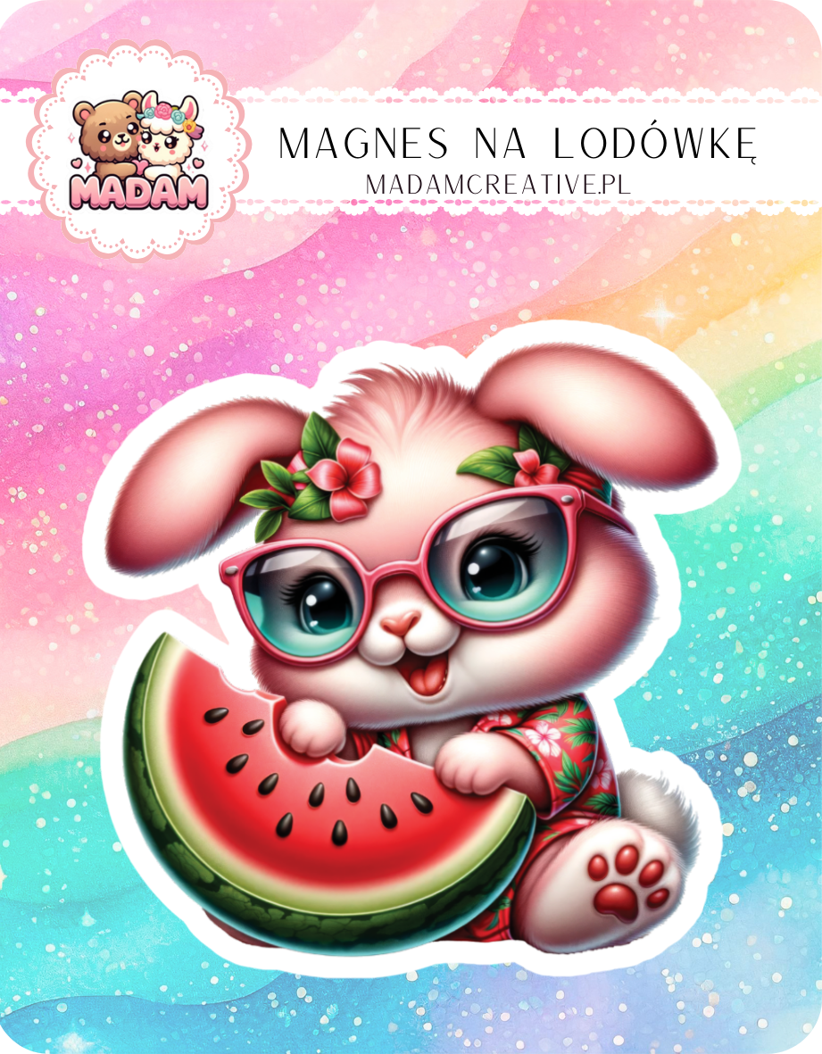 Magnes na lodówkę MaDam Króliczek Kasia – Arbuz w jednej łapce, okulary na nosie – Kasia zawsze gotowa na letnie zabawy!