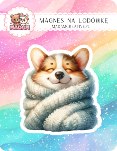 Magnes na lodówkę MaDam Piesek Puszek – Zawinięty w koc, gotowy na filmowe wieczory – popcorn w łapce!