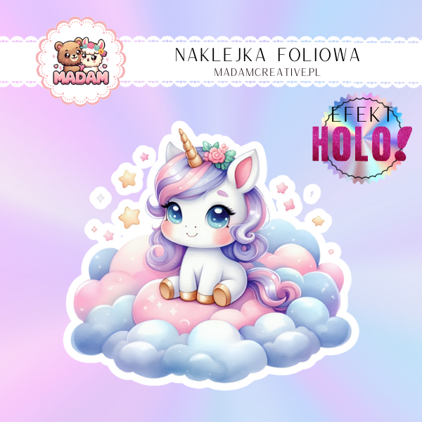 Naklejka Foliowa Holograficzna Jednorożec w Kwiecie – Urocza Harmonia z Chmurką! Madam