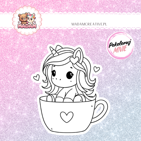 Naklejka do Kolorowania dla Dzieci Jednorożec w Filiżance – Magiczne Latte z Tęczową Pianką! MaDam Creative
