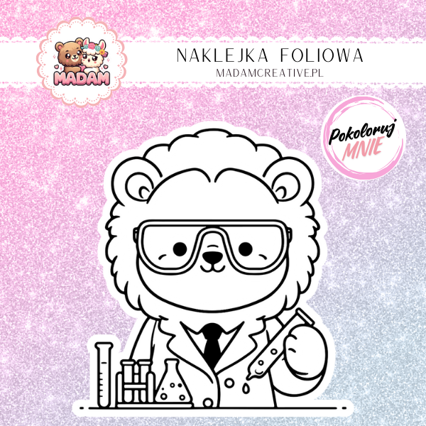 Naklejka do Kolorowania dla Dzieci Lew Naukowiec – Chemia w Grzywie! MaDam Creative