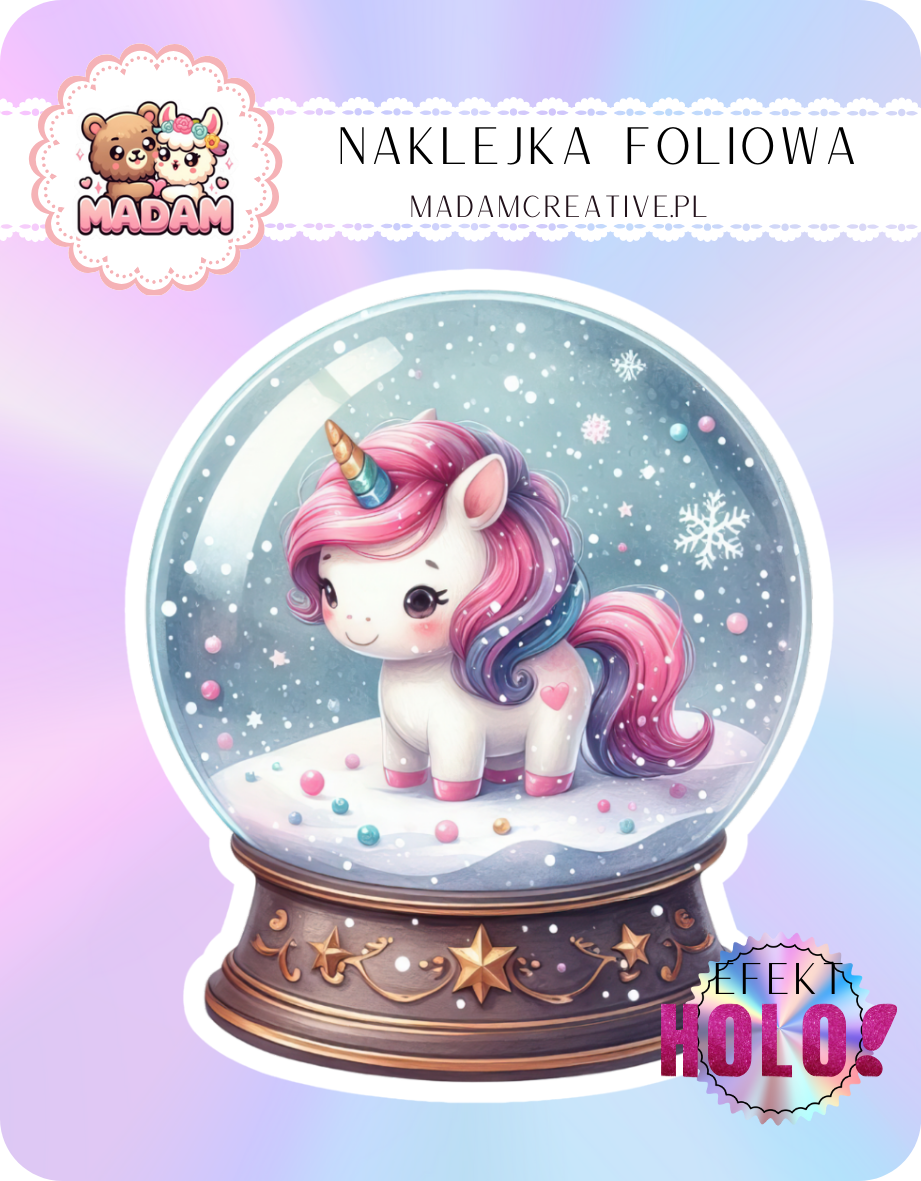 Naklejka foliowa pojedyncza Holograficzna MaDam Jednorożec w kuli śnieżnej – Zamknięty w kuli? Więcej miejsca na słodycze!