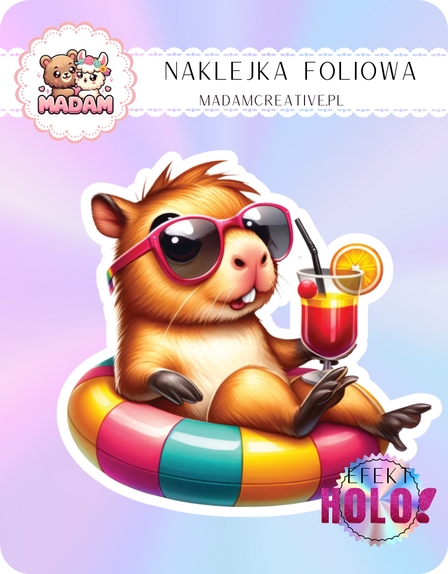Naklejka foliowa pojedyncza Holograficzna MaDam Kapibara Kuba – Koktajl w łapie i zero stresu!