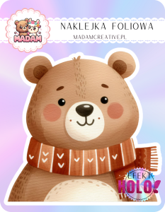 Naklejka foliowa pojedyncza Holograficzna MaDam Zima Miś Marek w szaliku – Zimą ciepły szalik to podstawa, nawet przy lodówce!