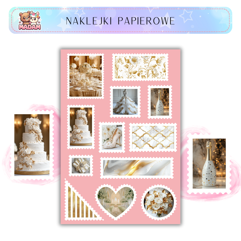 Naklejki znaczki pocztowe Białe i złote Ślubne od MaDam Creative – arkusz 13 × 19 cm idealny do bullet journali, plannerów, scrapbookingu i kreatywnych dekoracji.