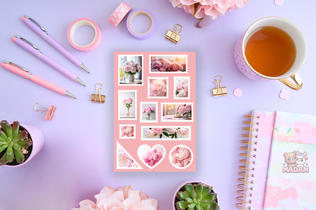 Naklejki Znaczki Pocztowe Piwonie (Peonies) Bullet Journal Scrapbooking – MaDam Creative