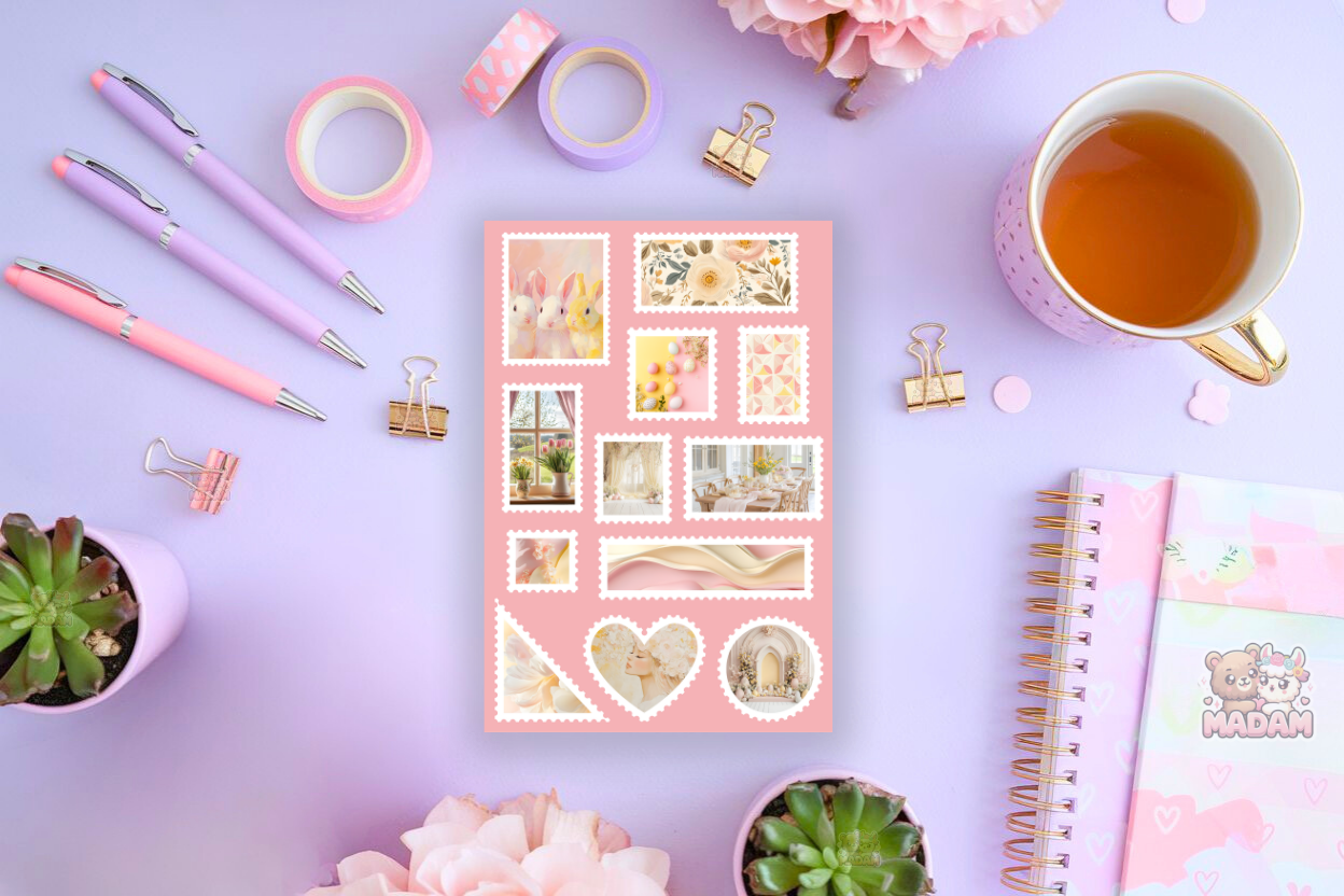 Naklejki znaczki pocztowe słoneczna Wielkanoc od MaDam Creative – arkusz 13 × 19 cm idealny do bullet journali, plannerów, scrapbookingu i kreatywnych dekoracji.