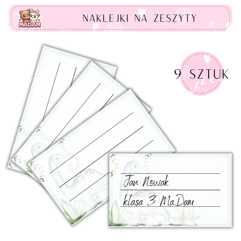 Naklejki do opisywania na zeszyty Dinozaur 9 sztuk, MaDam
