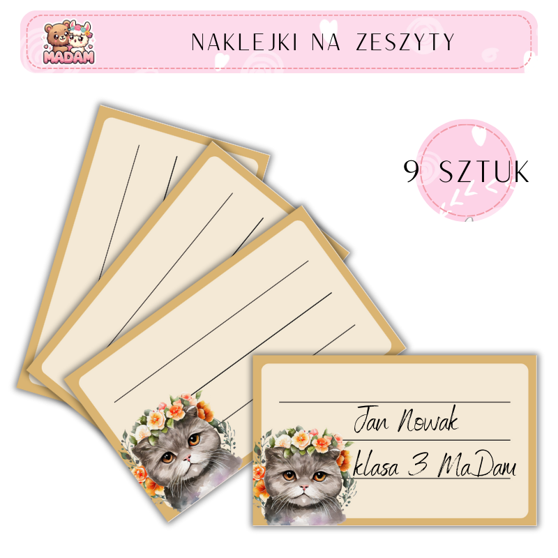 Naklejki do opisywania na zeszyty Kot 9 sztuk, MaDam