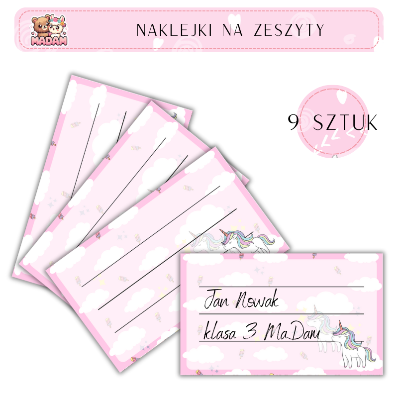 Naklejki do opisywania na zeszyty Unicorn 9 sztuk, MaDam