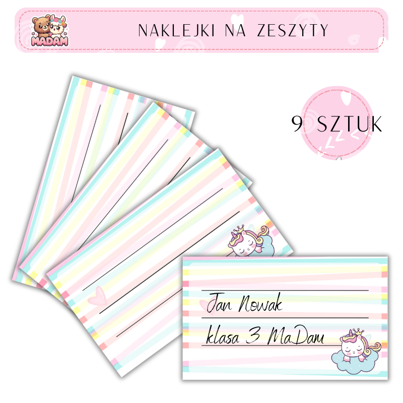 Naklejki do opisywania na zeszyty Unicorn 9 sztuk, MaDam