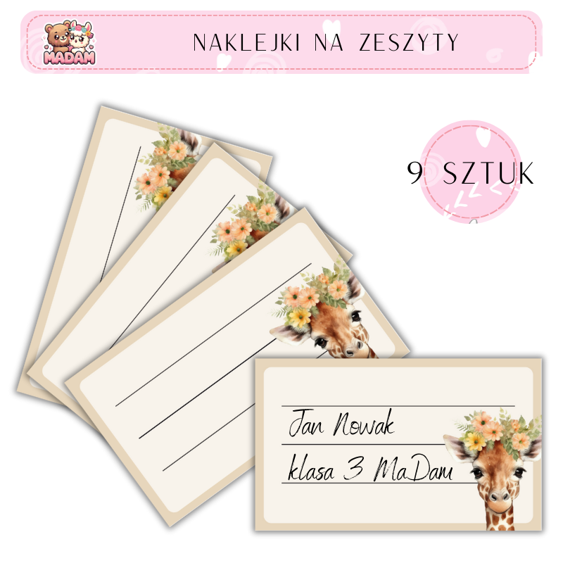 Naklejki do opisywania na zeszyty Żyrafa 9 sztuk, MaDam