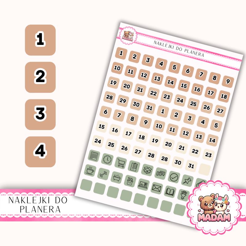 Chcesz uporządkować swoje notatki, kalendarz i zadania w estetyczny oraz czytelny sposób? Naklejki do planera, kalendarza i Bullet Journal MaDam Creative to praktyczne narzędzie do planowania, które pomaga lepiej zarządzać czasem, porządkować strony i tworzyć spójny, przejrzysty układ w planerze, bullet journalu lub kalendarzu.