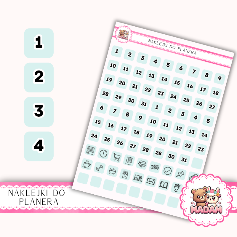 Naklejki do planera Dni Miesiąca i Ikony 13×18 – Mięta Szałwiowa – MaDam Creative