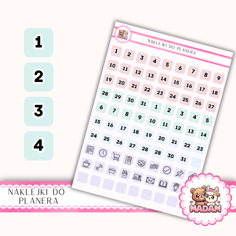 Naklejki do planera Dni Miesiąca i Ikony 13×18 – Wiosenny Mix Pastelowy – MaDam Creative