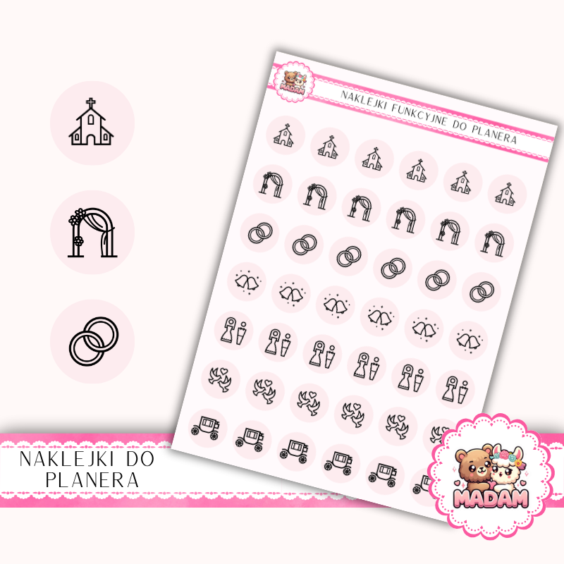 Naklejki do planera Ikony Funkcyjne Ceremonia Ślubna 13×18 – obrączki, kościół Róż Płatkowy – MaDam Creative