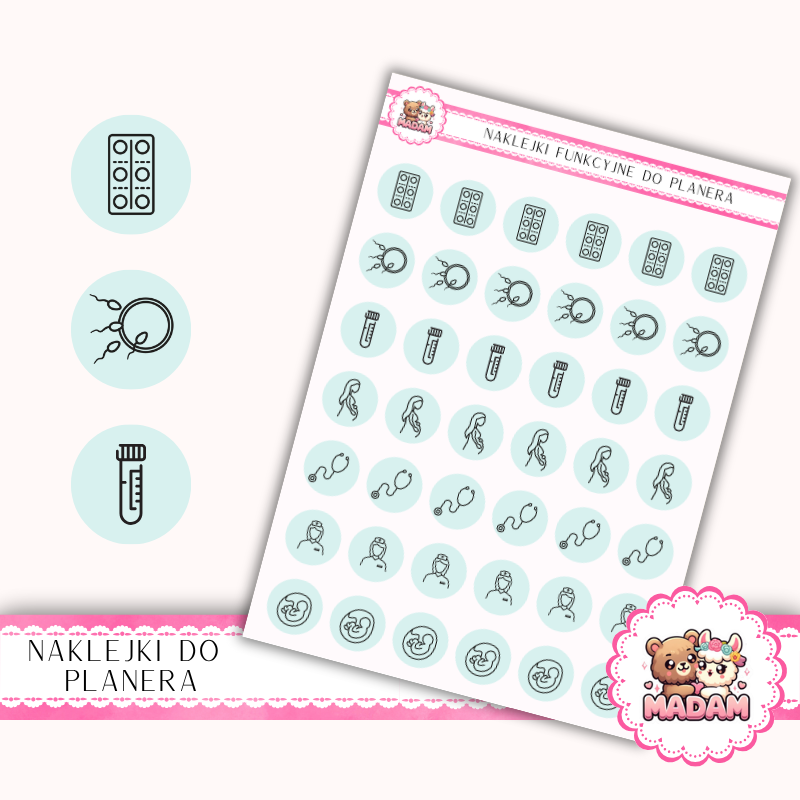 Naklejki do planera Ikony Funkcyjne Ciąża: Od Testu do USG 13×18 Mięta Szałwiowa – MaDam Creative