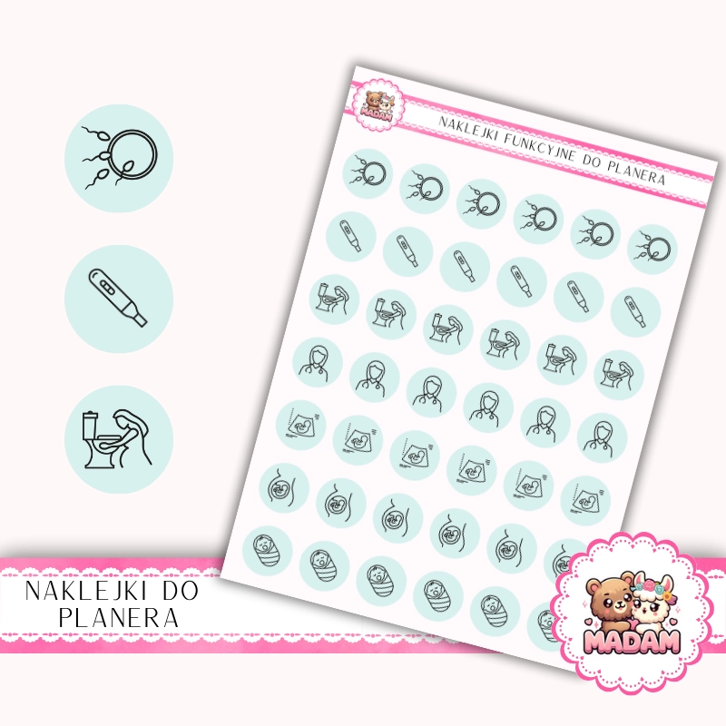 Naklejki do planera Ikony Funkcyjne Ciąża: Test, Lekarz i Pierwsze Wizyty 13×18 Mięta Szałwiowa – MaDam Creative