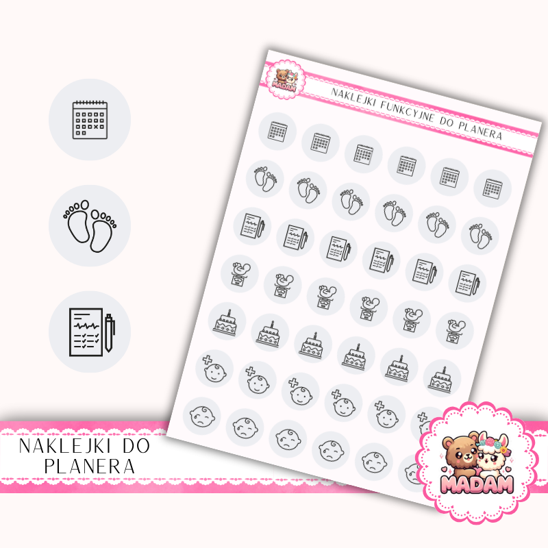 Naklejki do planera Ikony Funkcyjne Dokumenty i Kamienie Milowe 13×18 – baby milestones Popiel Jasny – MaDam Creative