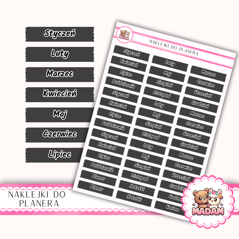 Naklejki do planera Nazwy Miesięcy 13×18 Grafitowy – Cały Rok – MaDam Creative