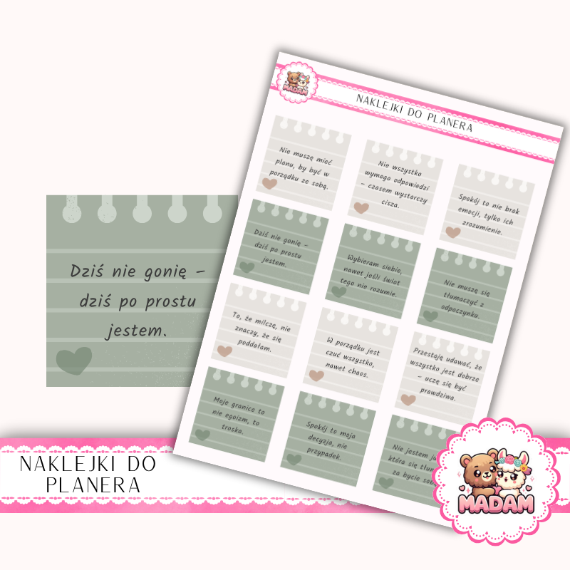 Naklejki planerowe MaDam Creative zostały stworzone z myślą o osobach, które chcą planować skuteczniej i czytelniej. Sprawdzają się zarówno w codziennych notatkach, jak i w długoterminowym planowaniu tygodnia czy miesiąca. Dzięki nim łatwiej wyróżnisz ważne zadania, uporządkujesz sekcje w planerze i nadasz swoim stronom spójny wygląd.