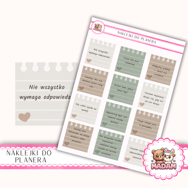 Naklejki planerowe MaDam Creative zostały stworzone z myślą o osobach, które chcą planować skuteczniej i czytelniej. Sprawdzają się zarówno w codziennych notatkach, jak i w długoterminowym planowaniu tygodnia czy miesiąca. Dzięki nim łatwiej wyróżnisz ważne zadania, uporządkujesz sekcje w planerze i nadasz swoim stronom spójny wygląd.