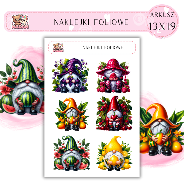 Naklejki foliowe Gnomy Owoce 6 sztuk na arkuszu, MaDam