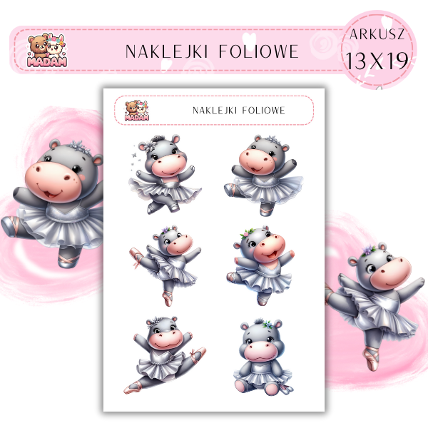 Naklejki foliowe Hipopotam Baletnica 6 sztuk na arkuszu, MaDam