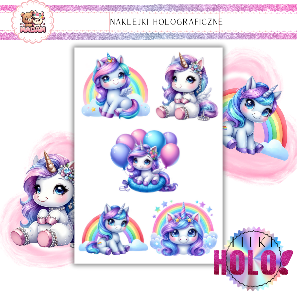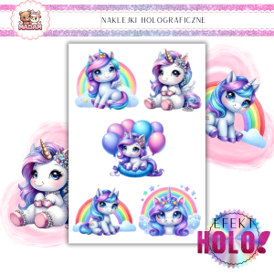 Naklejki foliowe Holograficzne Jednorożce Unicorn z wodoodpornym klejem 5 sztuk 6 cm, MaDam