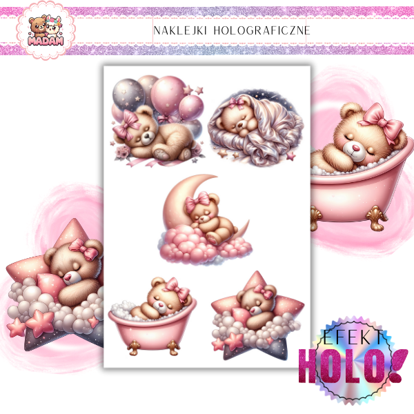 Naklejki foliowe Holograficzne Słodkie Misie z wodoodpornym klejem 5 sztuk 6 cm, MaDam