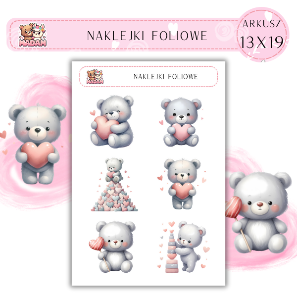Naklejki foliowe Misie Love 6 sztuk na arkuszu, MaDam