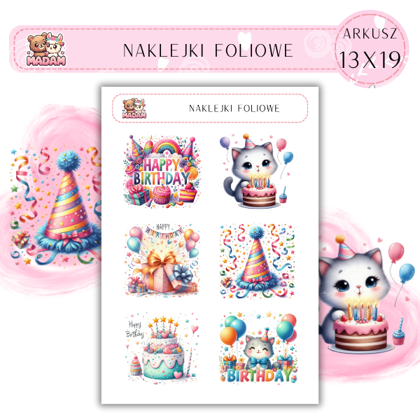 Naklejki foliowe Urodziny 6 sztuk na arkuszu, MaDam