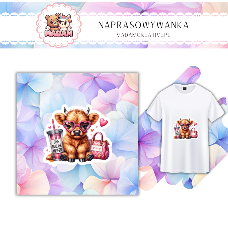 Naprasowywanka na ubrania MaDam - Mała Słodka Krowa - Elegancka krowa z różową torebką – kto się oprze? 11.5 cm