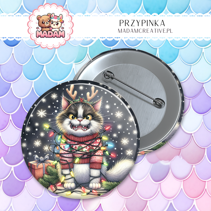 Przypinka 58mm MaDam Kot w roli renifera – Rogi są na miejscu, prezenty mogą być!
