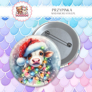 Przypinka 58mm MaDam Krowa z czapką świętego Mikołaja – Spokojne święta – idealne dla każdej krowy!
