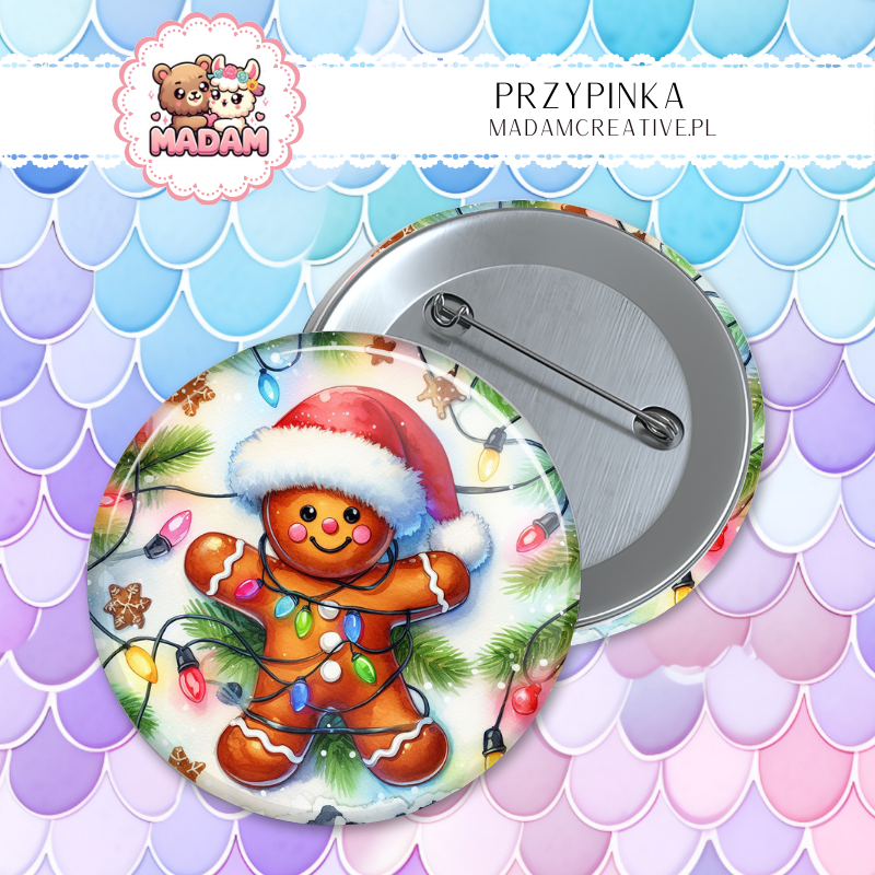 Przypinka 58mm MaDam Piernikowy ludzik w świątecznych lampkach – Święta smakują lepiej z pierniczkiem!