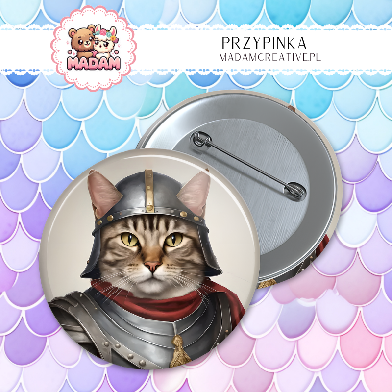 Przypinka 58mm MaDam Rycerski kotek – Obrońca domu przed kurzem i psem sąsiada!