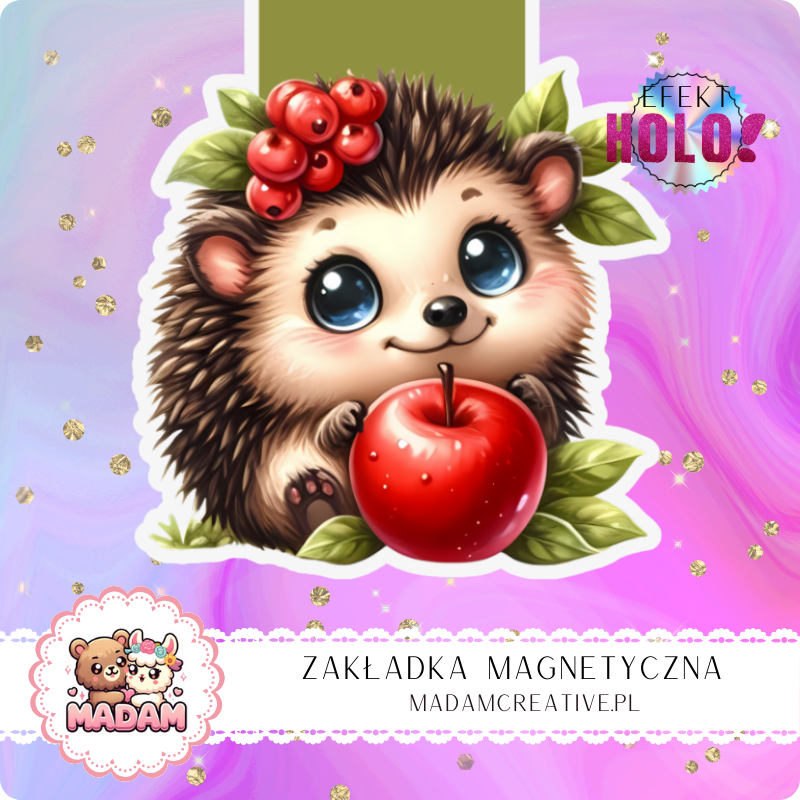 Zakładka Magnetyczna Holograficzna MaDam Jeżyk Julek – Z jabłkiem w łapkach, prosto z lasu do Twojej książki!